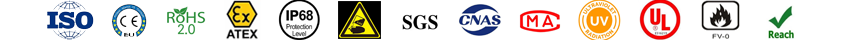 公司取得ISO9001:2015、CE、ROHS2.0、Reach、IEC、UL、IP68、DIN5510、低煙無鹵測試、低溫測試、阻燃測試、老化試驗、耐腐蝕、ATEX等認證。正在申請CCC、CQC、MDD認證、PED認證(2014/68/EU)、APIQ1等認證。